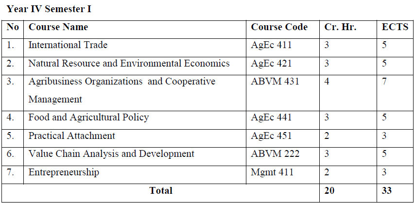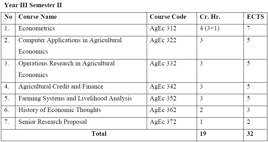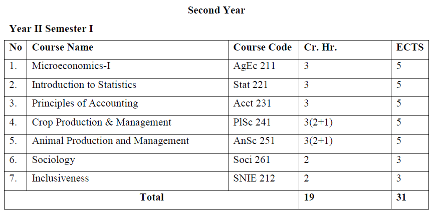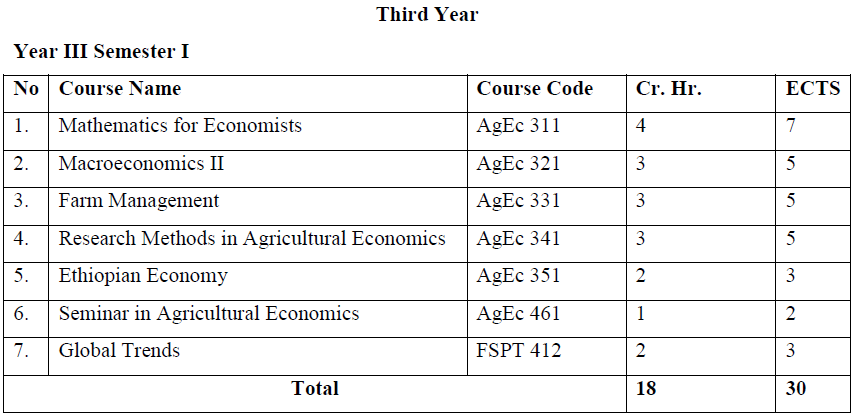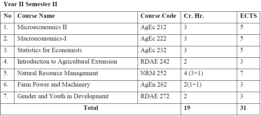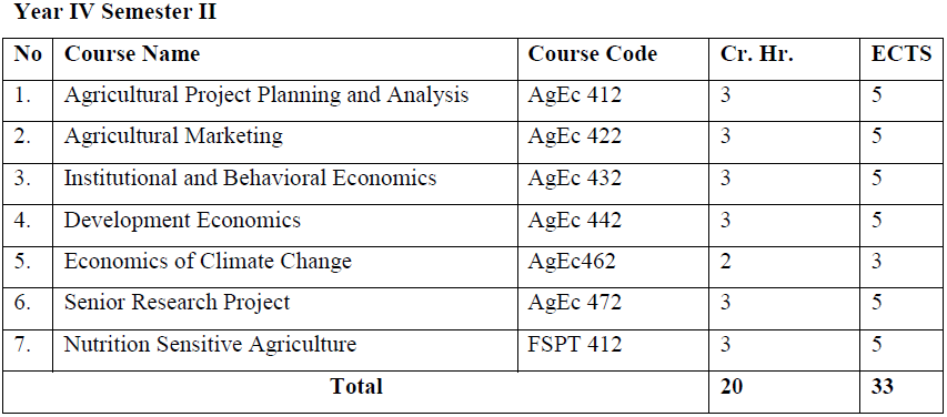 A four-year academic time is required to acquire a Bachelor of Science (B.Sc.) degree in Agricultural Economics. Students will join the program after successfully completing first year common courses. Since the program is a multidisciplinary and reasonably quantitative, students should have a strong background in mathematics.